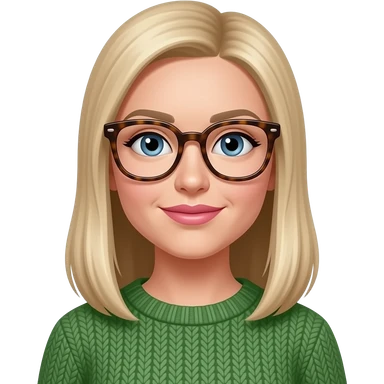 a white woman with long, chest length, darker straight long blonde hair. she should be wearing thick rimmed tortise shell glasses, pinker lips, wearing a green sweater and have blue eyes. emoji