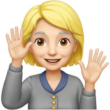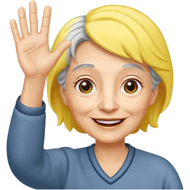 old woman with gray and yellow hair smiling and waving her hand emoji