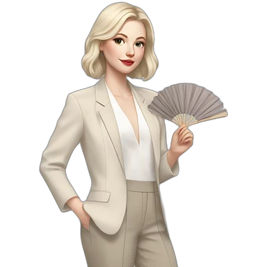 pale skin woman with ash blonde Straightened bob Hair, White Spacious classical jacket, beige palazzo Arrow pants and gray blouse holding a fan color palette in the hands emoji