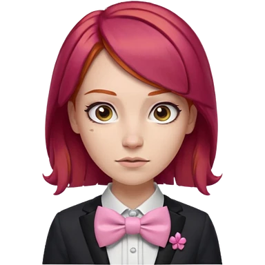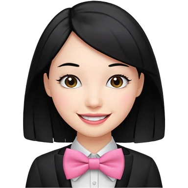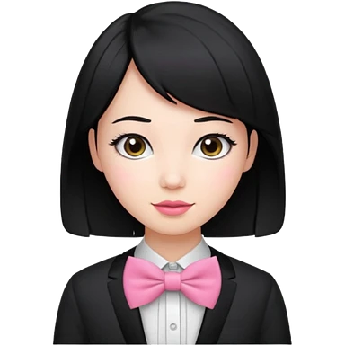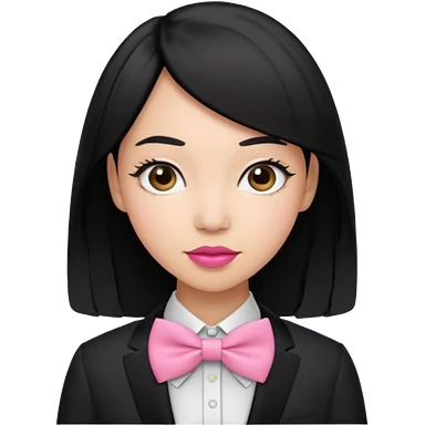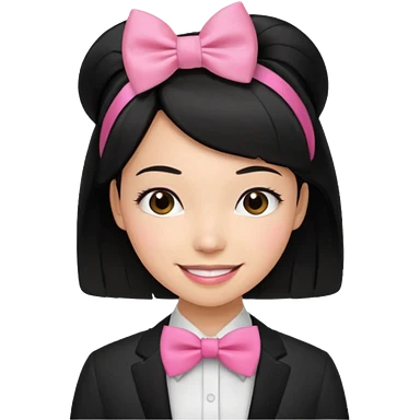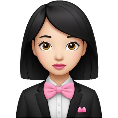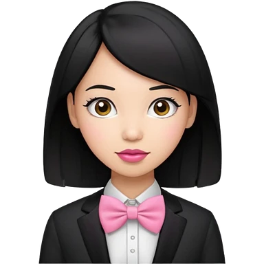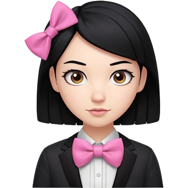 Woman with long dark hair wearing black suit with a black bow tie emoji