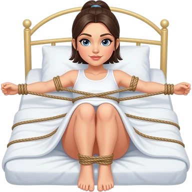 woman with ponytail on bed with arms and legs tied with rope shibari emoji