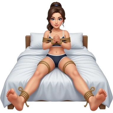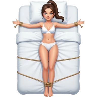 woman in white underwear with ponytail on bed with arms and legs tied with rope shibari emoji