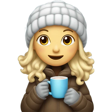 Girl with blonde hair, ear muffs, a beanie, with a puffy jacket holding hot coco in apple woman emoji style emoji