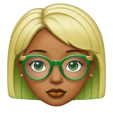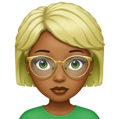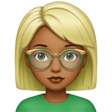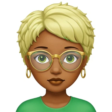 Caramel skin black woman 52 with green glasses that have gold edges and very blonde hair that’s very short but still puffy and small emoji
