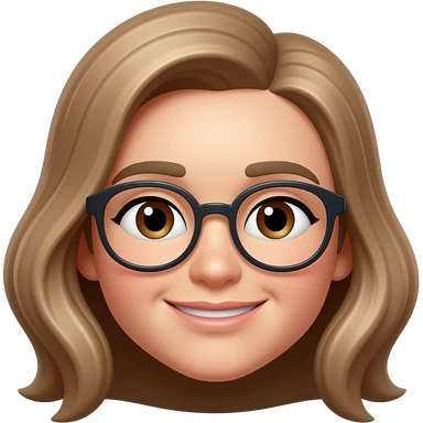 Apple Memoji style avatar of a woman, light skin tone, medium-length light brown hair slightly wavy with a side part, round thin dark glasses, brown eyes, oval face, natural eyebrows, friendly soft smile, realistic Apple memoji 3D style, portrait framing, neutral background, high quality render. emoji