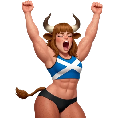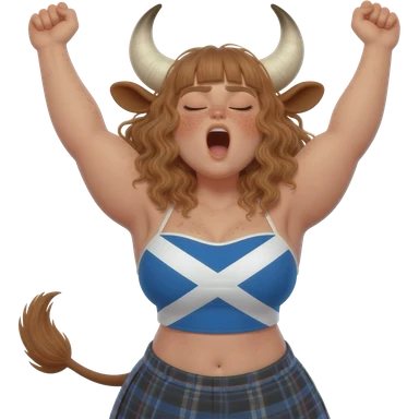 big buff curly woman with blue eyes with frecles with light brown messy hair with straight bangs with brown cow tail with fat thights with cow horns and cow brown ears with extra large breasts dressed in crop top with scottish flag stretches her arms up emoji