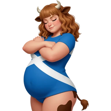 sleepy muscular hairy buff curly woman with frecles with light brown messy hair with straight bangs with brown cow tail with fat thights with cow horns and cow brown ears with extra large breasts dressed in stretched T-shirt with scottish flag hugs herself by her shoulder squints one eye emoji