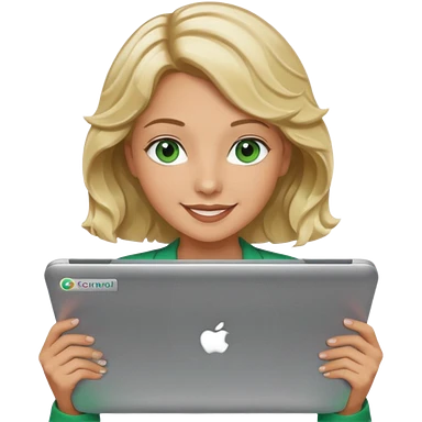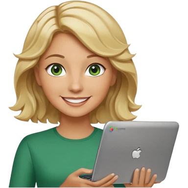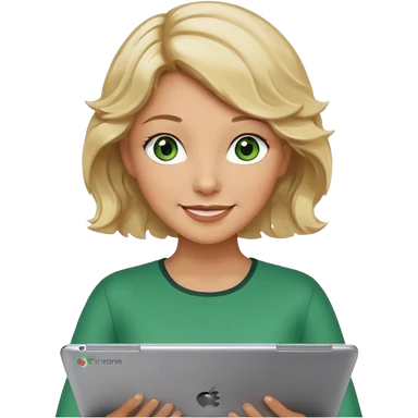 short wavy blonde hair tan skin teacher green eyes woman happy holding chromebook emoji