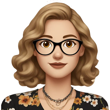 Woman with shoulder-length wavy dark blonde hair, fair complexion with freckles, cat eye makeup, wearing a black floral blouse, thin necklace with a round pendant, multiple rings, and bracelets. large glasses with thin frame emoji | AI Emoji Generator