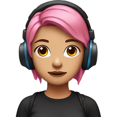 woman, pink hair, blue eyes, headphones, black shirt, frowning emoji