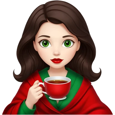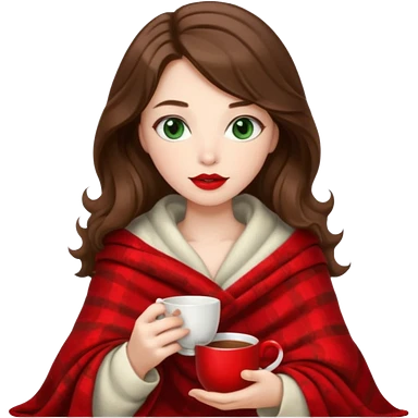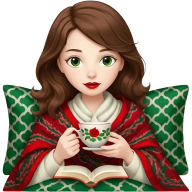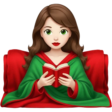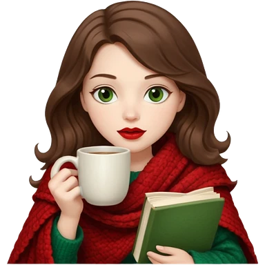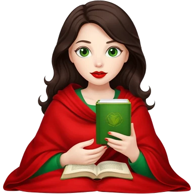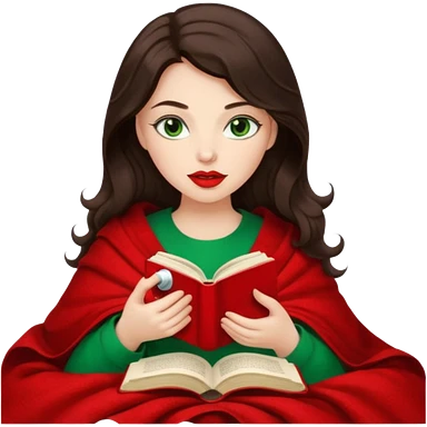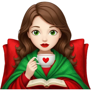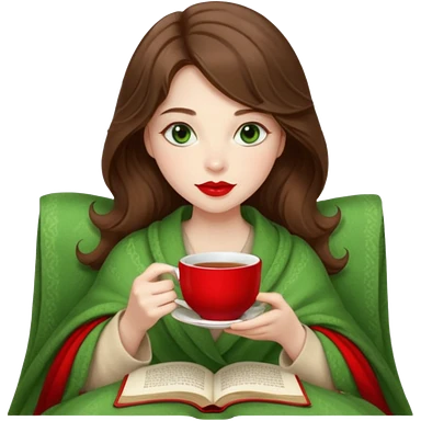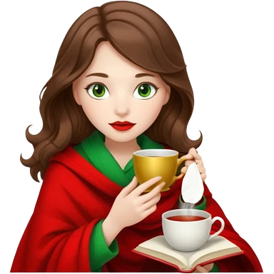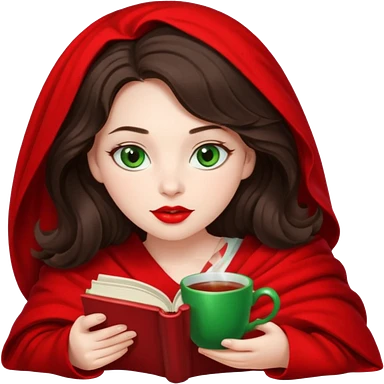 Long wavy dark brown haired, white skinned, dark big green eyed girl with red lipstick wrapped in a red blanket, sipping tea and reading a book emoji