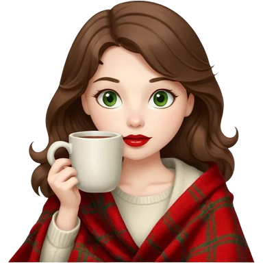 Girl with brown hair and blue eyes sipping on a tea wrapped in a plaid blanket emoji