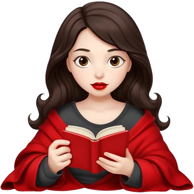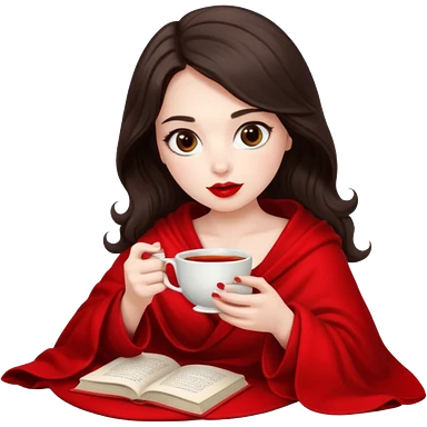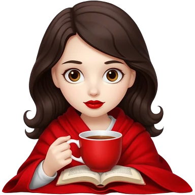 Long wavy dark brown haired, white skinned, dark big eyed girl with red lipstick wrapped in a red blanket, sipping tea and reading a book emoji