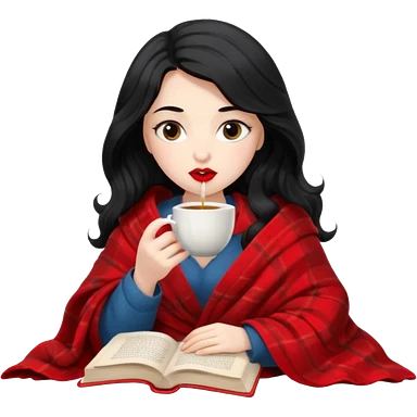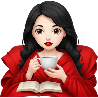 Long wavy Black haired, white skinned, dark big eyed girl with red lipstick wrapped in a blanket, sipping tea and reading a book emoji