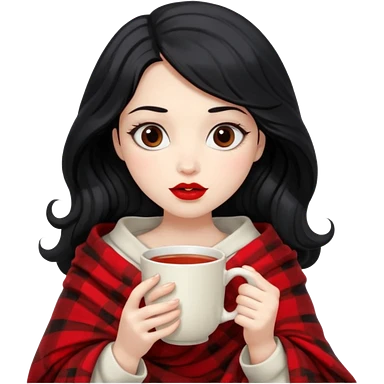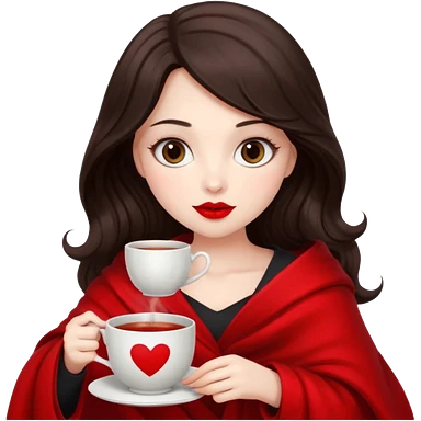 Long wavy Black haired, white skinned, black big eyed girl with red lipstick wrapped in a blanket, sipping tea emoji