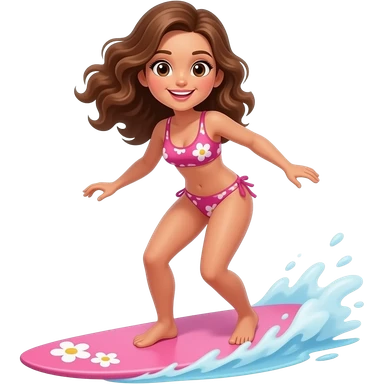 women surfing on pink cute board with flowers and she has wavy brown hair emoji
