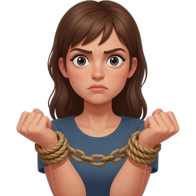 woman bound with rope around her chest, angry face, emoji style emoji