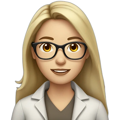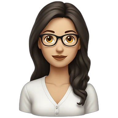 White woman with long dark brown straight hair and green eyes using glasses writing emoji