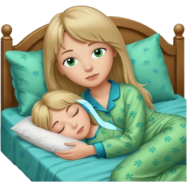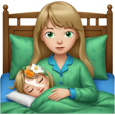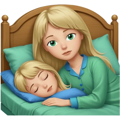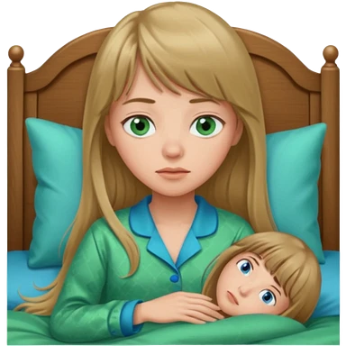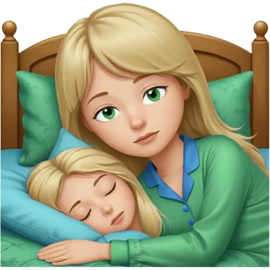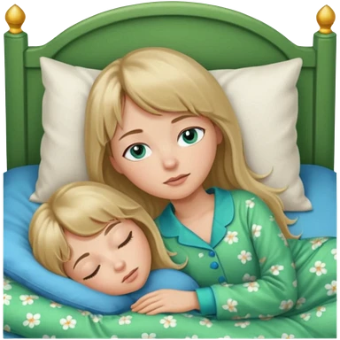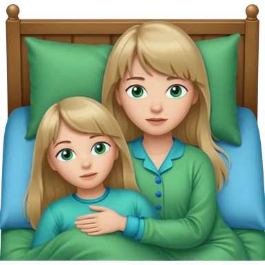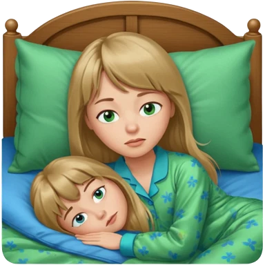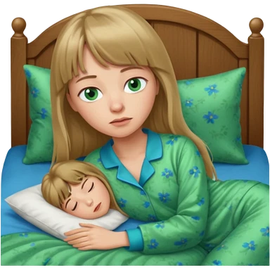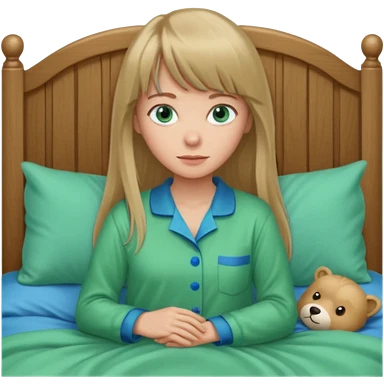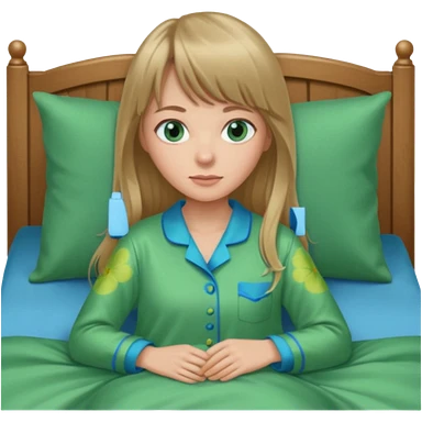 Woman with blue eyes and long dark blond hair and a bang, sleeping in bed with green pyjama emoji