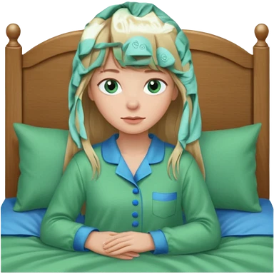Woman with long dark blond hair and bang, blue eyes sleepy in bed with green pyjama emoji