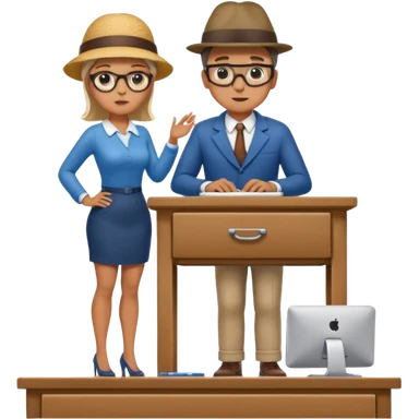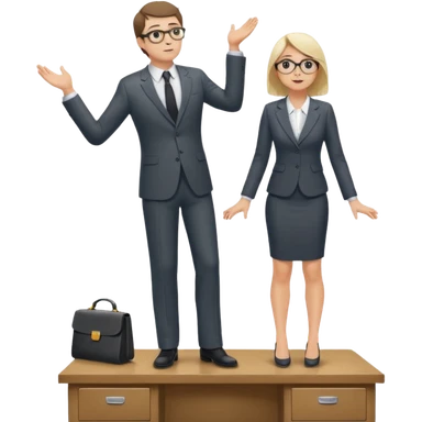 A very tiny man standing on top of a giant woman's desk looking up at her emoji