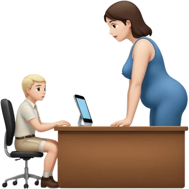 A micro sized man standing on top of a giant woman's desk looking up at her as she works emoji