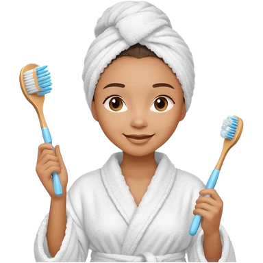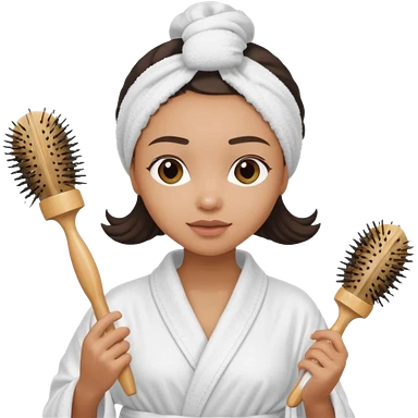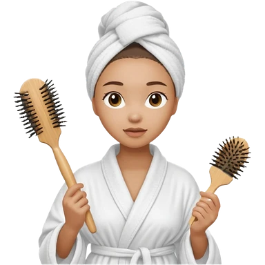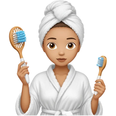 lightskin Women wearing shower robe and their hair with towel holding one brush emoji