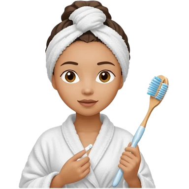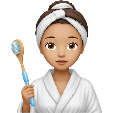 clean white girl long brown hair in robe brushing teeth hair up after shower emoji