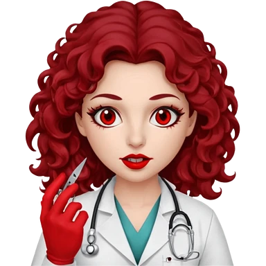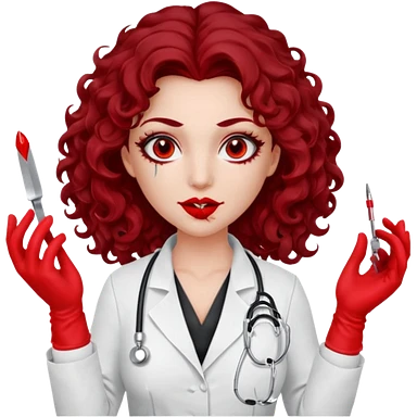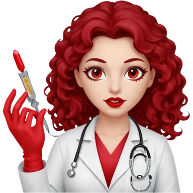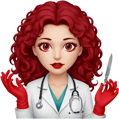 Lilith scalpel in hand, evil surgeon sexy surgeon clothes. She has red eyes. She has dark brown long curly hair. Wears sexy doctor outfit with red gloves. Covers mouth neck and nose with red litham for Muslim woman emoji