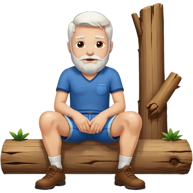 A white haired man with a beard sitting on a piece of wood wearing shorts emoji