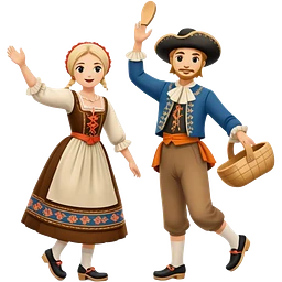 Cinematic Realistic scene of two performers executing the Klompendans, dressed in traditional Dutch costumes complete with wooden clogs and detailed folk patterns, captured in lively motion with soft, natural lighting emoji