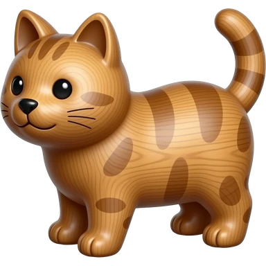 A carved wooden full cat toy emoji, made of warm oak with a smooth, polished finish. The cat has simple, rounded features with engraved details for eyes and nose, giving it a handcrafted, vintage look. The texture of natural wood grain is visible, adding authenticity. emoji
