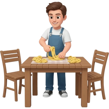 WOODEN OUTDOOR TABLE with chairs, making pasta emoji