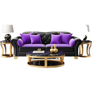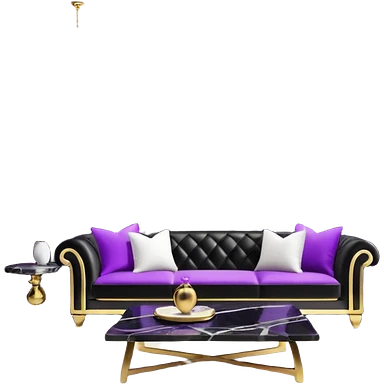Luxurious black marble living room with gold and white accents and with a purple accented pillow emoji