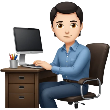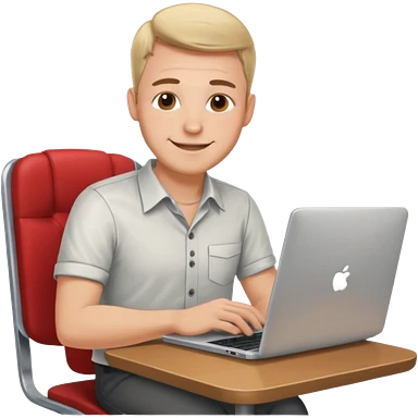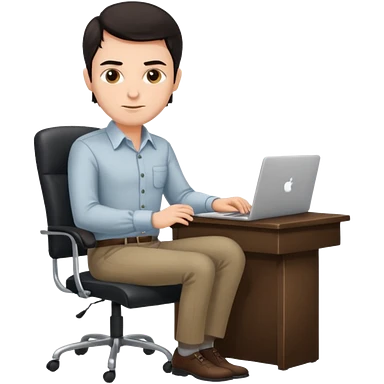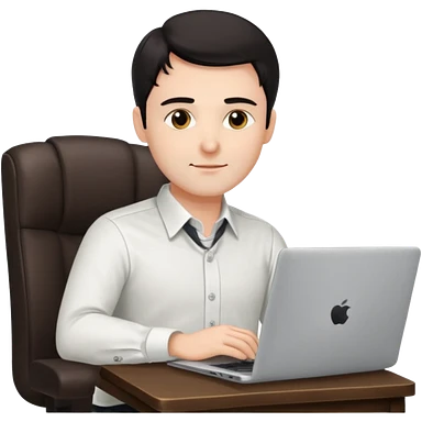 Rich man working setting on a chair in shirt, dark hair, and near the desk with laptop he is german very beautiful looks like emoji