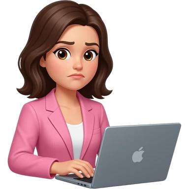 brunette woman with medium length hair wearing pink blazer working on laptop making a sick face emoji