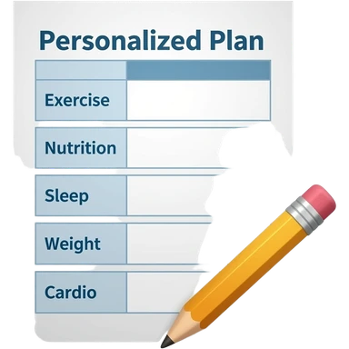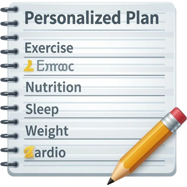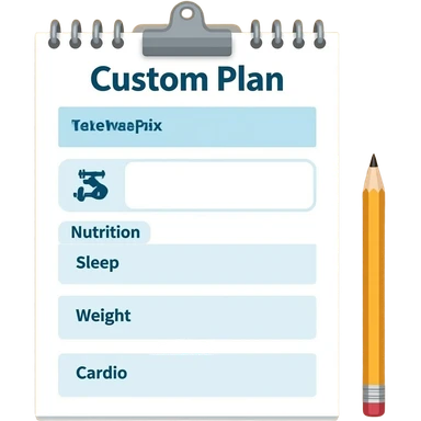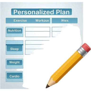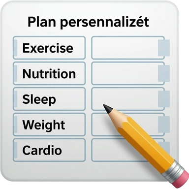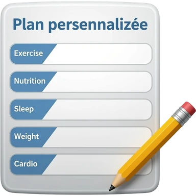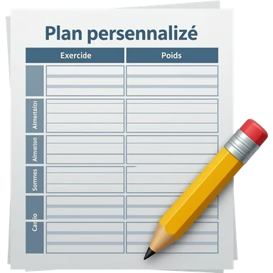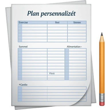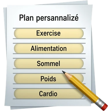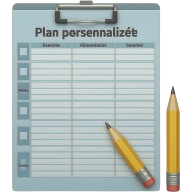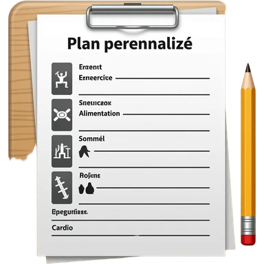 A gym workout plan, with a pencil in the corner and titled "Plan personnalisé" should clearly state the following: Exercice, Alimentation, Sommeil, Poids, Cardio. this is French emoji
