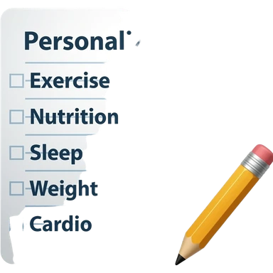 A gym workout plan, with a pencil in the corner and titled "Personal Plan," should clearly state the following: "- exercice - alimentation - sommeil - poids - cardio" emoji