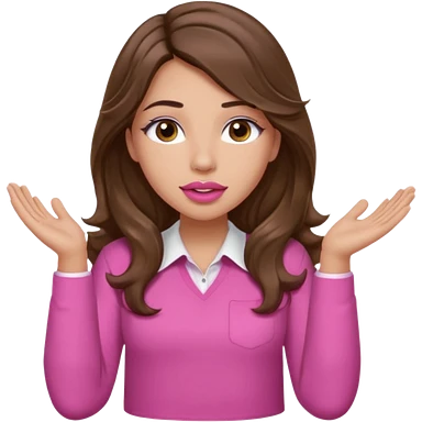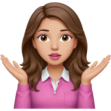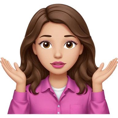 girl with long wavy brown hair, brown eyes, light to medium complexion, in a pink shirt, pink lips, long lashes, puckered lips, both hands all the way up for worship emoji