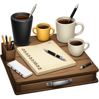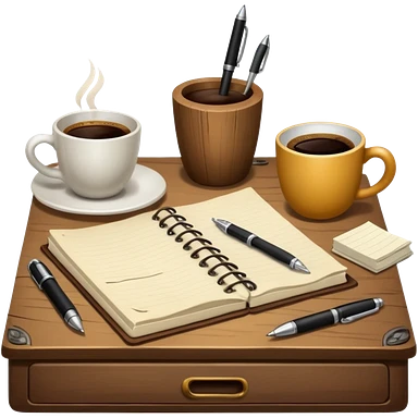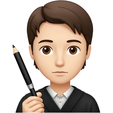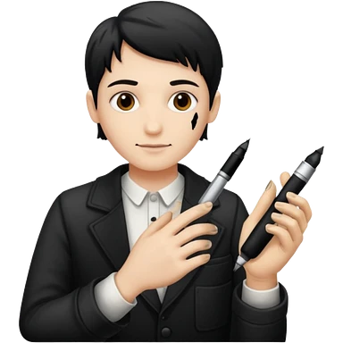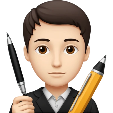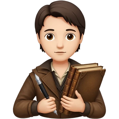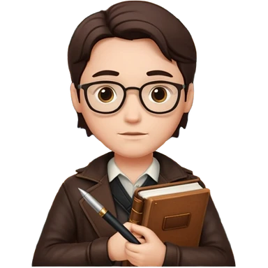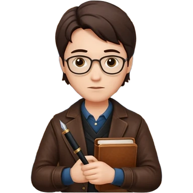 writer holding pen in hand and closed book in other hand, with black curly hair and wearing glasses emoji