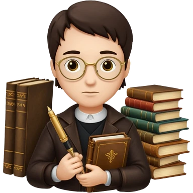writer holding big pen in hand and closed book in other hand, wearing glasses emoji