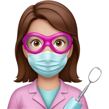 Dentista mujer con mascarilla rosada, cabello marron, piel blanca, camisa rosada, ojos marrones, sin lentes emoji