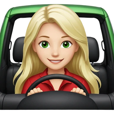 A Sideview of A Smiling Green Eyed, Long Haired Blonde driving a RED NISSAN ROGUE SUV emoji