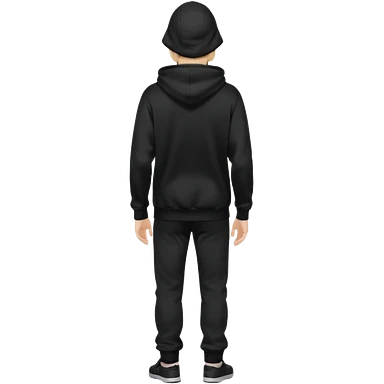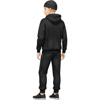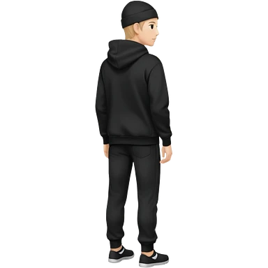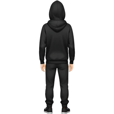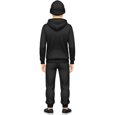 fullbody caucasian man in black hoodie on head, hands in pockets and black pants rear backview emoji