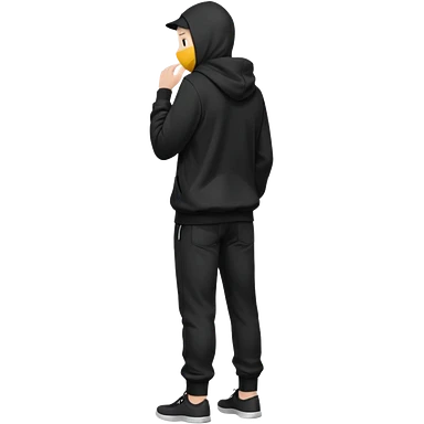 fullbody Mysterious shy caucasian man in black hoodie on head, hands in pockets and black pants rear backview emoji