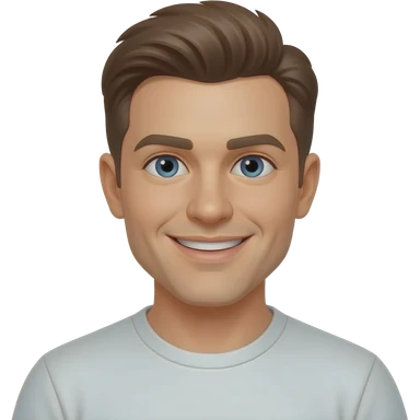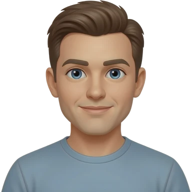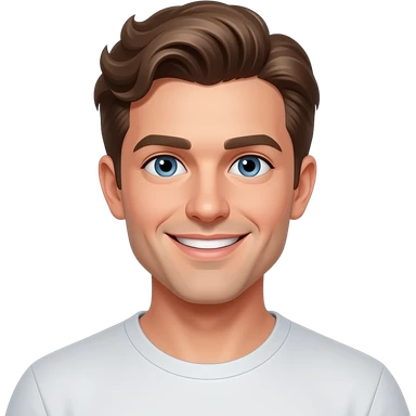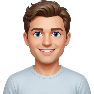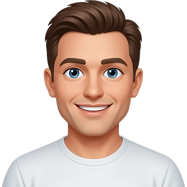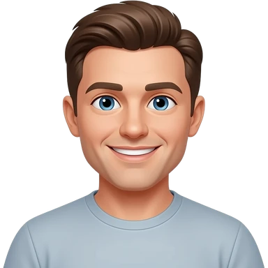 30 year old man, clean shaven, smiling with blue eyes and brown hair parted on right, in t-shirt emoji