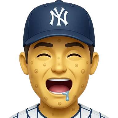 Yellow 3d emoji, New York Yankees hat, drooling mouth open, covered in warts, closed drooping eyes emoji