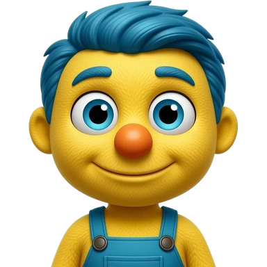 Yellow Guy from Don’t Hug Me I’m Scared, Yellow puppet big cartoon eyes, round orange nose, and short blue hair, wearing turquoise overalls emoji