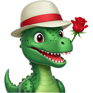 Dorothy the Dinosaur from The Wiggles with white hat with red rose, green skin emoji