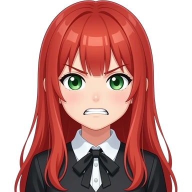 anime girl grimacing expression long red hair green eyes black blouse with white collar emoji